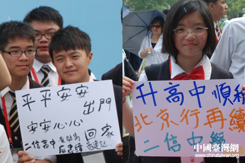 同樣穿著“文化共生,視野共享”字樣的文化衫,兩岸學子在他們動手種植的小樹旁寫上自己的心愿、開心拍照留念,一張張紙板上寫著“升高中順利,北京再會”、“希望來北京上大學”等等期望。在師生們大小相機閃爍中,陳云林也用繁體字題寫下“情牽兩岸,樹連親情”的心愿卡。