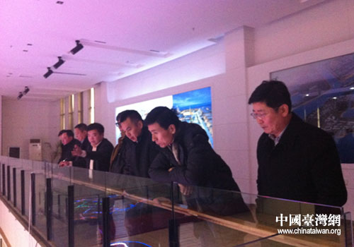 趙明一行邊看沙盤邊聽經濟區領導介紹情況。(圖片來源:盤錦市臺辦)