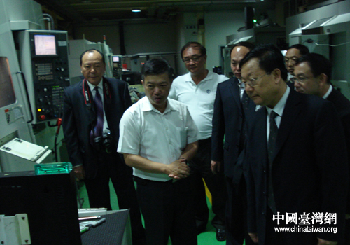 撫順市委副書記喻國(guó)偉一行在參觀臺(tái)灣精銳科技有限公司生產(chǎn)車間。(圖片來(lái)源:撫順市臺(tái)辦)