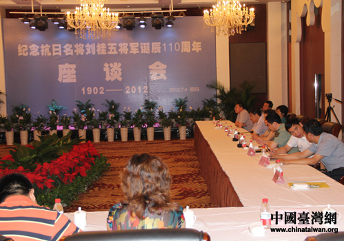 中國臺灣網7月6日朝陽消息 7月4日上午,在抗日名將劉桂五將軍誕辰110周年之際,遼寧省朝陽市隆重召開紀念抗日英雄劉桂五將軍誕辰110周年座談會。遼寧省臺辦副主任李成山、宣傳處長孫巖,省委統戰部、民革省委及朝陽市四大班子、軍分區領導,市直有關部門,社會團體負責人,部分專家學者,省市新聞媒體以及將軍家鄉朝陽縣委、縣直有關單位,六家子鎮黨政領導,劉桂五將軍的親屬及抗日名將后人60余人出席座談會。