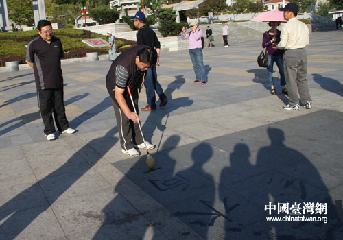 一支長長的塑料筆管,套上一塊海綿制作的軟軟的筆頭,就能在地面上一氣呵成揮寫出剛勁有力或舒展飄逸的草書、行書等各種字體的書法,臺灣同胞禁不住也上前一試。“一江春水向東流、臺灣……”,臺灣同胞專注的神情和一招一式、一筆一畫的認真姿態贏得大家的掌聲。(中國臺灣網丹東市臺辦通訊員 孫國輝)