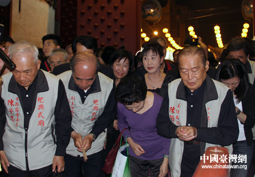 95歲的臺(tái)灣祀典武廟主委陳柏青(右一)率信眾恭迎山西關(guān)公祖廟圣像駐駕。(中國(guó)臺(tái)灣網(wǎng) 李典典 攝)