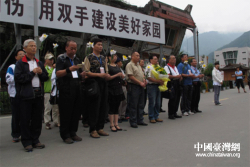 參訪團(tuán)一行在北川老縣城悼念遇難同胞。(圖片來源:四川省臺辦)