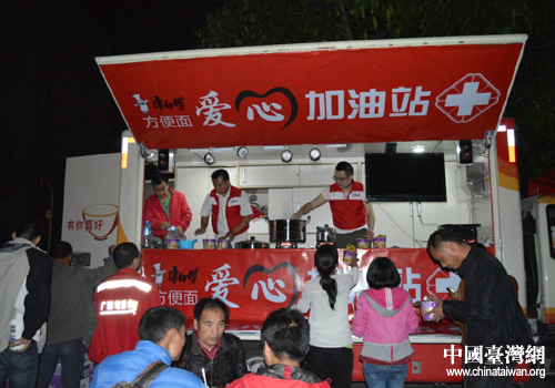 康師傅在蘆山縣設(shè)立“愛心加油站”現(xiàn)場為災(zāi)民及救援人員提供烹煮好的熱泡面。(圖片來源:四川省臺辦)