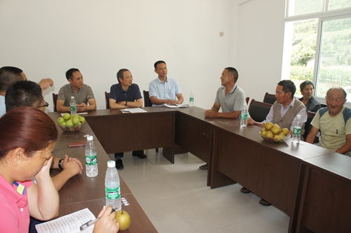 四川省臺辦主任周敏謙(左二)向海子村干部了解扶貧項目推進情況