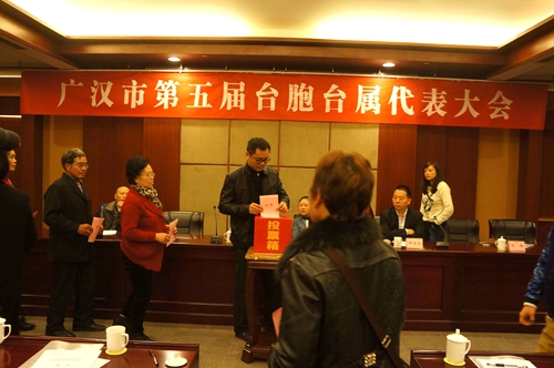 中國臺灣網11月23日廣漢訊 11月15日,四川廣漢市召開第五屆臺胞臺屬代表大會,選舉產生新一屆臺胞臺屬聯誼會領導班子。廣漢市政協副主席許峻、市委統戰部常務副部長、市臺辦主任曹光軍等出席會議,來自全市各行各業的36名臺胞臺屬代表參會。