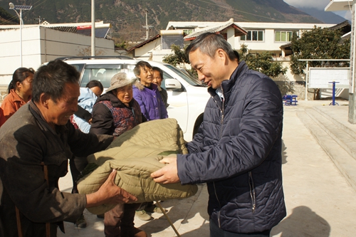 四川省臺(tái)辦主任周敏謙(右)慰問海子村貧困戶并送上御寒物品
