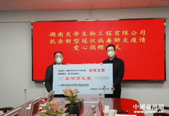 2月4日 湖南炎帝生物工程有限公司向株洲市慈善總會捐贈100萬元 直接用于武漢防疫一線。 (中國臺灣網 發)