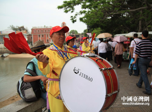 5月17日,來自海峽兩岸的民眾在廈門思明區(qū)鼓浪嶼舉行盛大頌典,共祭民族英雄鄭成功。由此,正式拉開了“鄭成功文化節(jié)”的大幕。圖為“夠勁兒”的鼓手大爺。(中國臺灣網 邵磌 攝)