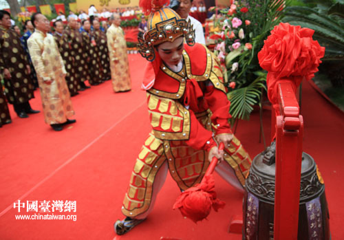 “鼓初嚴(yán)、再嚴(yán)、三嚴(yán)”,在大陸主祭人鄭家麟和臺(tái)灣主祭人、奉祀鄭成功聯(lián)合會(huì)理事長(zhǎng)簡(jiǎn)慶雄的率領(lǐng)下,兩岸52位陪祭、同祭人行禮如儀。國(guó)家文化部副部長(zhǎng)趙少華、博鰲亞洲論壇秘書(shū)長(zhǎng)龍永圖等,以及來(lái)自兩岸的數(shù)百位民眾亦全體肅立,向民族英雄致敬。