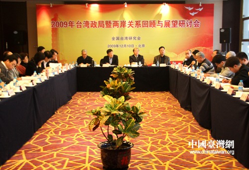 中國臺(tái)灣網(wǎng)12月10日北京消息 由全國臺(tái)研會(huì)舉辦的“2009年臺(tái)灣政局暨兩岸關(guān)系回顧與展望研討會(huì)”今日上午在北京召開。有來自清華大學(xué)、人民大學(xué)、廈門大學(xué)、北京聯(lián)合大學(xué)臺(tái)灣研究院、中華文化發(fā)展促進(jìn)會(huì)等涉臺(tái)機(jī)構(gòu)的20余位專家學(xué)者共聚一堂,回顧2009年兩岸關(guān)系發(fā)展歷程,并對(duì)今后兩岸關(guān)系的和平發(fā)展建言獻(xiàn)策。
