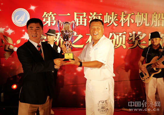 中國帆船帆板運動協會副主席李全海為獲獎帆船頒獎。(中國經濟網記者何東憲 攝)