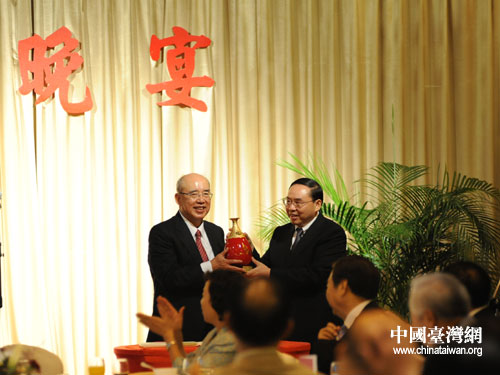 中國國民黨榮譽(yù)主席吳伯雄在臺北圓山大飯店會見并宴請中共湖南省委副書記梅克保一行。圖為吳伯雄與梅克保互贈紀(jì)念品。(湖南省臺辦 李蘭 攝)