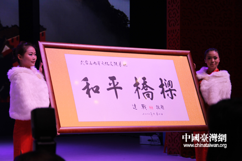 中國國民黨榮譽主席連戰題詞:“和平橋梁”。(中國臺灣網 李丹 攝)