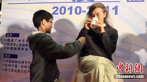 “我畫齡很長,畫技很高。以后,我要和蔡志忠老師一起‘切磋’漫畫技巧。”今天,浙江杭州舉辦的“美猴獎·我是動漫王”拜師儀式上,臺灣漫畫大師蔡志忠收下杭州11歲小弟子蔡和睿,這位子弟頗有狂氣,“切磋”兩字讓大師面露欣賞之色。回想起往事,蔡志忠由衷說道:“在我小時候,學(xué)漫畫是不被社會廣泛認可的。杭州能如此鼓勵小朋友畫漫畫,這讓我很感動。”