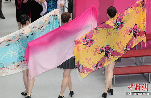3月21日下午,由上海市婦女聯合會主辦的“花開臺北·海派女性風采展”在臺北開幕,滬上112位杰出女性代表身著各式旗袍亮相花博會流行館,與相聚在此的臺灣婦女會總會姐妹們暢敘友情。圖為上海婦女代表團成員現場表演絲巾秀。中新社發 符永康 攝