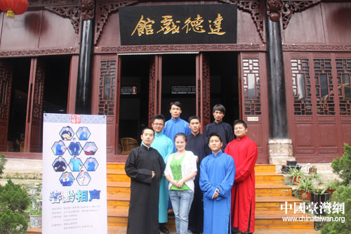 中國臺灣網(wǎng)7月13日貴陽消息 長衫、布鞋、折扇、醒木、手絹、快板,這幾個關(guān)鍵詞勾勒的,可不是一板一眼站在臺前說相聲的老夫子,而是幾個“80后”的年輕人——穆伍、洪方舟、陳丹等。每月第一、三周六晚上的8點,在貴陽市達德書院,“春黔相聲工作室”的幾個80后年輕人會身穿長衫,手拿快板,用夾雜著現(xiàn)代詞匯的“傳統(tǒng)相聲”來博得滿場的喝彩。通過網(wǎng)絡(luò)了解到貴陽有這樣一群熱愛、傳承中華傳統(tǒng)藝術(shù)的年輕人,臺灣東森電視臺《生活接力棒》欄目組便來到這里對他們進行采訪,希望向廣大觀眾傳遞一種精神——夢想與堅持。