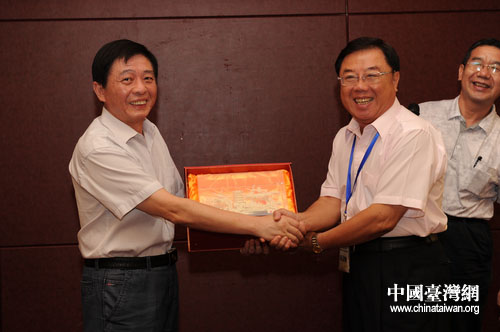 湖北省臺(tái)辦主任劉凱春向臺(tái)灣客人贈(zèng)送紀(jì)念品。(湖北省臺(tái)辦 陸勝 攝)