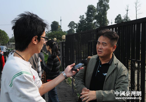 《兩岸愛(ài)心地圖》采訪(fǎng)組在都江堰“臺(tái)灣愛(ài)心家園”采訪(fǎng)成都臺(tái)商協(xié)會(huì)常務(wù)副會(huì)長(zhǎng)唐中柱。(圖片來(lái)源:四川省臺(tái)辦)