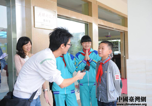 《兩岸愛(ài)心地圖》采訪(fǎng)組在都江堰采訪(fǎng)頂新新建小學(xué)學(xué)生。(圖片來(lái)源:四川省臺(tái)辦)