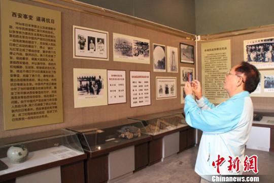 臺灣新北市體育總會執(zhí)行長傅朝華在用手機拍攝“西安事變 逼蔣抗日”史料。 李芳華 攝