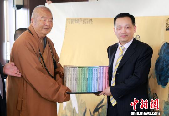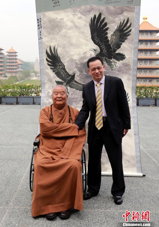 東盟-中國書畫家協(xié)會(huì)榮譽(yù)主席、大陸著名書畫家君壽12日來到高雄佛光山佛陀紀(jì)念館,拜會(huì)佛光山開山宗長星云大師,并將其歷時(shí)一年所完成長六米、寬一點(diǎn)五米的巨幅畫作《佛光普照金色荷塘》圖,贈(zèng)予大師。星云則以《百年佛緣》系列叢書回贈(zèng)。