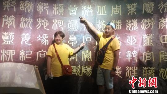 臺(tái)灣學(xué)生發(fā)現(xiàn)自己的姓氏也在百家姓展板上,特別開(kāi)心地讓同行的朋友幫忙合影留念。 林麗君 攝