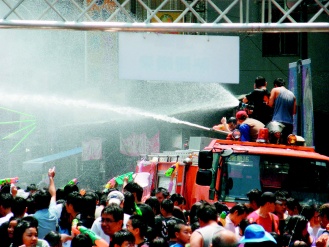 臺北縣消防局動用兩輛消防車加入潑水節(jié)。