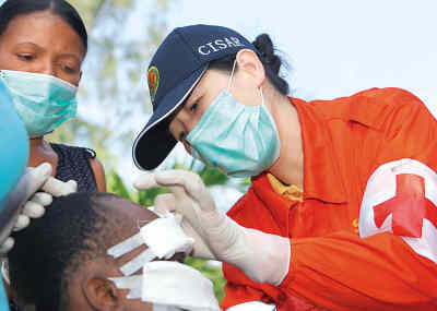 1月17日,一名中國國際救援隊醫(yī)療隊員在海地太子港為地震受傷人員換藥。當日,中國國際救援隊隊員深入災民集中居住區(qū)為受傷人員診治換藥和進行衛(wèi)生防疫工作。新華社記者 袁滿攝