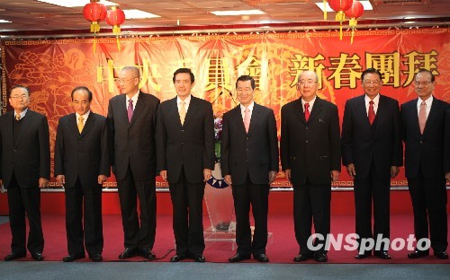 2月22日,中國國民黨中央委員新春團拜會在中央黨部十二樓舉行。圖為國民黨主席馬英九(左四)率黨的高層出席團拜會。中新社發 耿軍 攝