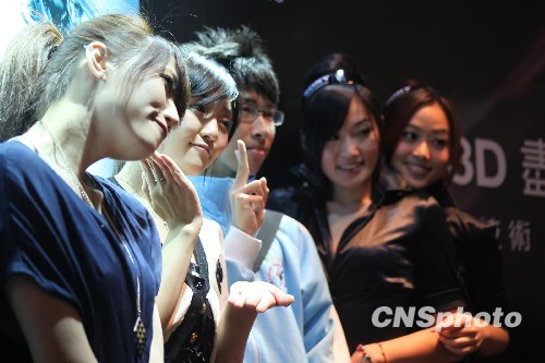4月8日,一家品牌電子廠商在臺北春季電腦展上以美女吸引參觀者合影,聚集人氣。當天,2010臺北春季電腦展開幕,各品牌廠商競打“美女秀”推介產品。中新社發 羅欽文 攝