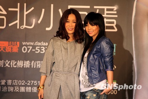 5月25日下午,大陸“情歌天后”那英“那20年世界巡回演唱會”臺北記者會舉行,臺灣“小天后”張惠妹(右)現身為好友站臺。董會峰 攝
