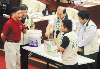 臺北市議會昨天聽取市長郝龍斌施政報告,民進黨議員莊瑞雄等人以真章魚質詢,希望章魚預測何人當選市長