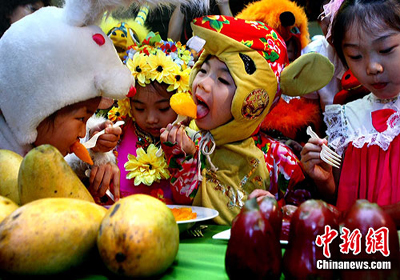 北京藍天兒童藝術團的孩子們,7月27日在臺北參加認養臺灣災區農業水果活動,這個藝術團將在臺灣進行大型歌劇公益演出,以支持在八八風災中受損的農戶,演出結束后他們還將前往臺北縣舉行愛心捐贈活動。中新社發 宋吉河 攝