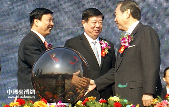 28日,魯臺經貿文化交流周暨2010山東臺灣名品博覽會在濟南國際會展中心開幕。圖為山東省委書記姜異康(左)、山東省長姜大明與臺北世貿中心董事長王志剛(右)在開幕式上。(中國臺灣網 張碩 攝)