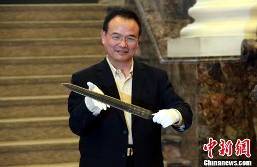 11月15日,有天下第一劍之謂的出土瑰寶“越王勾踐劍”,在臺(tái)北市襄陽(yáng)路上的臺(tái)灣博物館內(nèi)開(kāi)箱亮相。該館將從20日起與湖北省博物館等合作舉辦為時(shí)兩個(gè)多月的“劍舞楚天——越王勾踐劍暨楚國(guó)出土文物展”。圖為臺(tái)灣博物館館長(zhǎng)蕭宗煌在開(kāi)箱現(xiàn)場(chǎng)展示“越王勾踐劍”。
