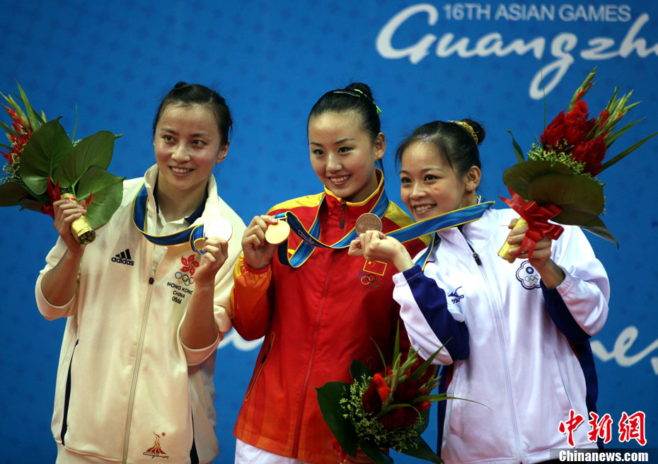 11月14日,在廣州南沙體育館進(jìn)行的亞運(yùn)會武術(shù)女子劍槍全能比賽中,中國選手闞文聰(中)勇奪金牌。銀牌和銅牌分別被中國香港選手鄭天慧(左)、中華臺北李汶容(右)獲得。中新社記者 湯彥俊 攝