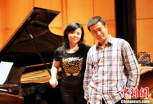 12月6日,大陸兩名知名青年鋼琴家陳薩(左)、王笑寒(右)攜逾2架百年的廈門鼓浪嶼古鋼琴,在臺(tái)北城市舞臺(tái)奉獻(xiàn)一場(chǎng)精彩的演出。圖為陳薩、王笑寒在演出前記者會(huì)上合影。兩位均在1980年出生的鋼琴家都在國際上多次獲獎(jiǎng)。兩架鼓浪嶼鋼琴博物館古鋼琴分別是1875年的史坦威與1937年的布魯斯納。