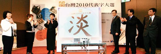 據臺灣媒體報道,景美女中拔河隊員李洳君以長滿繭的右手握住毛筆,緩慢而堅定地寫出“淡”字。臺灣2010代表字票選昨天揭曉,“淡”字以近萬票拔得頭籌,成為最能代表今年臺灣社會風景與民眾心景的漢字。
