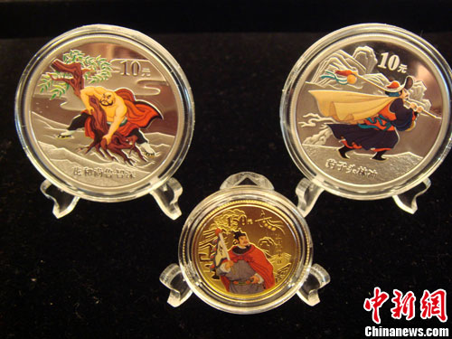 圖為中國人民銀行發行的《水滸傳》彩色金銀紀念幣(第1組)部分紀念幣圖片。