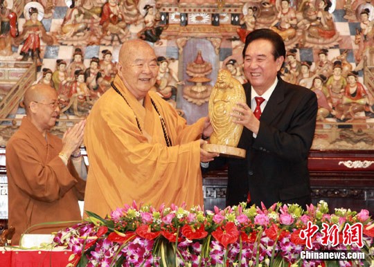 2月24日下午,大陸海協(xié)會(huì)會(huì)長(zhǎng)陳云林一行來(lái)到有“南臺(tái)佛都”之稱(chēng)的高雄佛光山參訪,受到星云法師及僧眾的熱烈歡迎。圖為陳云林(右)向星云法師贈(zèng)送木雕佛像。中新社記者 符永康 攝