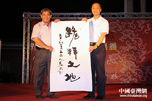 北京市文學藝術界聯合會駐會副主席黎晶揮毫潑墨,寫下“跪拜天地”四個大字,將展演氣氛推向高潮。黎晶并現場賦詩一首,表達自己激動的心情:“我們從北京牽出一條飄帶/你們從臺灣牽出一條飄帶/兩條彩色飄帶飄落在文隆村/打了一個結/從此我們的手牽手/從此我們的心連心……”(記者 董潔 圖/文)