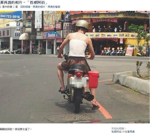 拍到“性感阿伯”的是臉書用戶“黃再晟”。他23日在馬路上發(fā)現(xiàn)“性感阿伯”,立刻拍下來上傳到臉書(Facebook),直呼“剛剛拍到的,穿這樣太猛了。”“真人真事親眼目睹,當(dāng)下震驚萬分!”據(jù)其它網(wǎng)友指出,拍照地點(diǎn)在彰化市中山路2段。