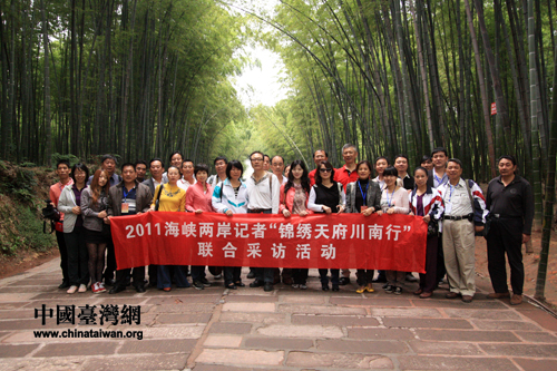 兩岸記者在蜀南竹海的“翡翠長廊”上合影留念。(中國臺灣網 馬迪 攝)