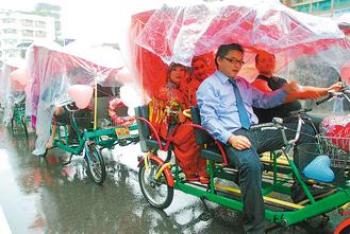 宜蘭市民陳信宏,身著古裝,迎娶女友鐘佩娟,二人以協力車為禮車,相當特別。(圖片來源于:臺灣《聯合報》)