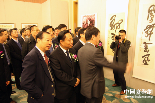 參加開幕式的嘉賓在樓柏安的陪同下參觀畫展中的書畫精品。(中國臺灣網 蕪同 攝)