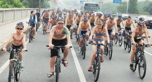 昨日,株洲60多位自行車愛好者,赤膊上身涂著彩繪騎行全城,倡導“低碳、環保”的健康生活理念,為奧運助威。他們中的17位還將前赴寶島臺灣進行為期十三天的環臺灣騎行。“我們想用這種行為藝術來宣傳低碳與環保,倡導綠色的出行方式。”隊員們表示。譚平華 張平 攝影報道