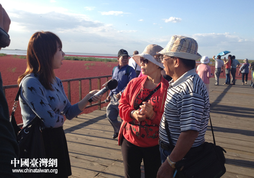 中國臺灣網(wǎng)9月18日錦州消息 日前,來自臺灣TVBS電視臺的兩名記者,到濕地之都盤錦拍攝天下奇觀——紅海灘。拍攝的過程中,主持人廖小姐意外的聽到了家鄉(xiāng)的口音,原來是來自臺灣新竹的游客要到朝鮮去旅游,特意繞道盤錦要看一看紅海灘到底是什么樣的奇特景觀。
