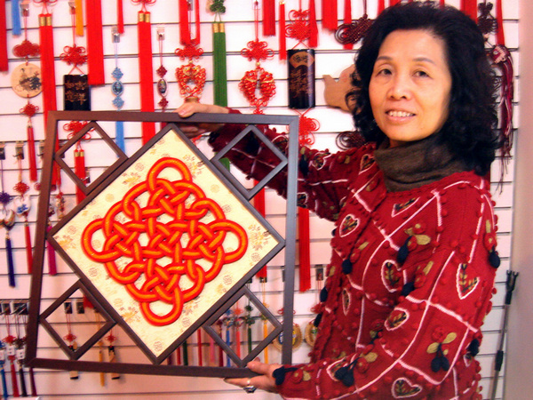“麒麟呈祥”、“彩蝶比翼”、“魚躍龍門”、“十二生肖”……臺商林淑麗的小店里陳列著各式各樣色彩繽紛做工考究的中國結編織藝術品。20年前,她跟隨丈夫千里迢迢來到云南昆明,擅長女紅的她在祥云街8平米的店鋪里賣起了“中國結”。