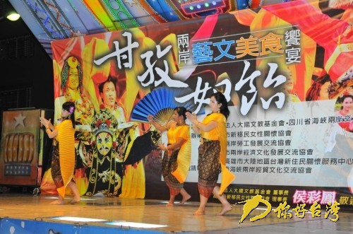 本場演出除了四川民族歌舞團(tuán)帶去的節(jié)目之外,臺灣同胞也上臺進(jìn)行了聲樂演奏、舞蹈等表演,兩岸同胞同樂。而演出場地一圈,還有數(shù)十個臺灣美食大排檔,當(dāng)?shù)厥忻癯丝梢孕蕾p文藝表演,也還可以品嘗到當(dāng)?shù)孛朗场?/p>